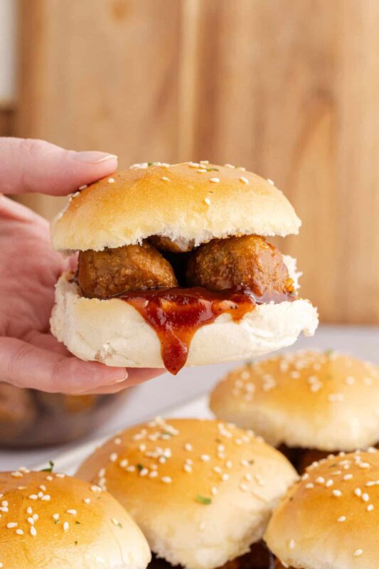 These Meatball Sliders are the perfect bite-sized comfort food! Juicy meatballs coated in tangy BBQ sauce are nestled between soft buns, brushed with butter, and topped with sesame seeds for a deliciously toasty finish.