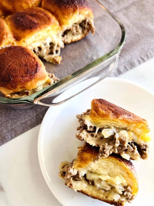 If I set a tray of these cheeseburger sliders on the table, they disappear fast. They’ve got all the classic burger flavor in soft, cheesy sliders and are perfect for feeding hungry kids, game day crowds, or an easy weeknight dinner.